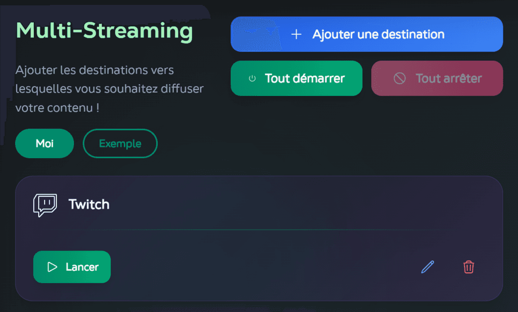 Si vous être le.la collaborateur.ice, une fois l'invitation acceptée, vous avez accès aux destinations et informations de stream (URL et Clé de Stream) directement depuis votre onglet "Multi-Streaming".