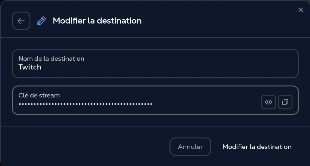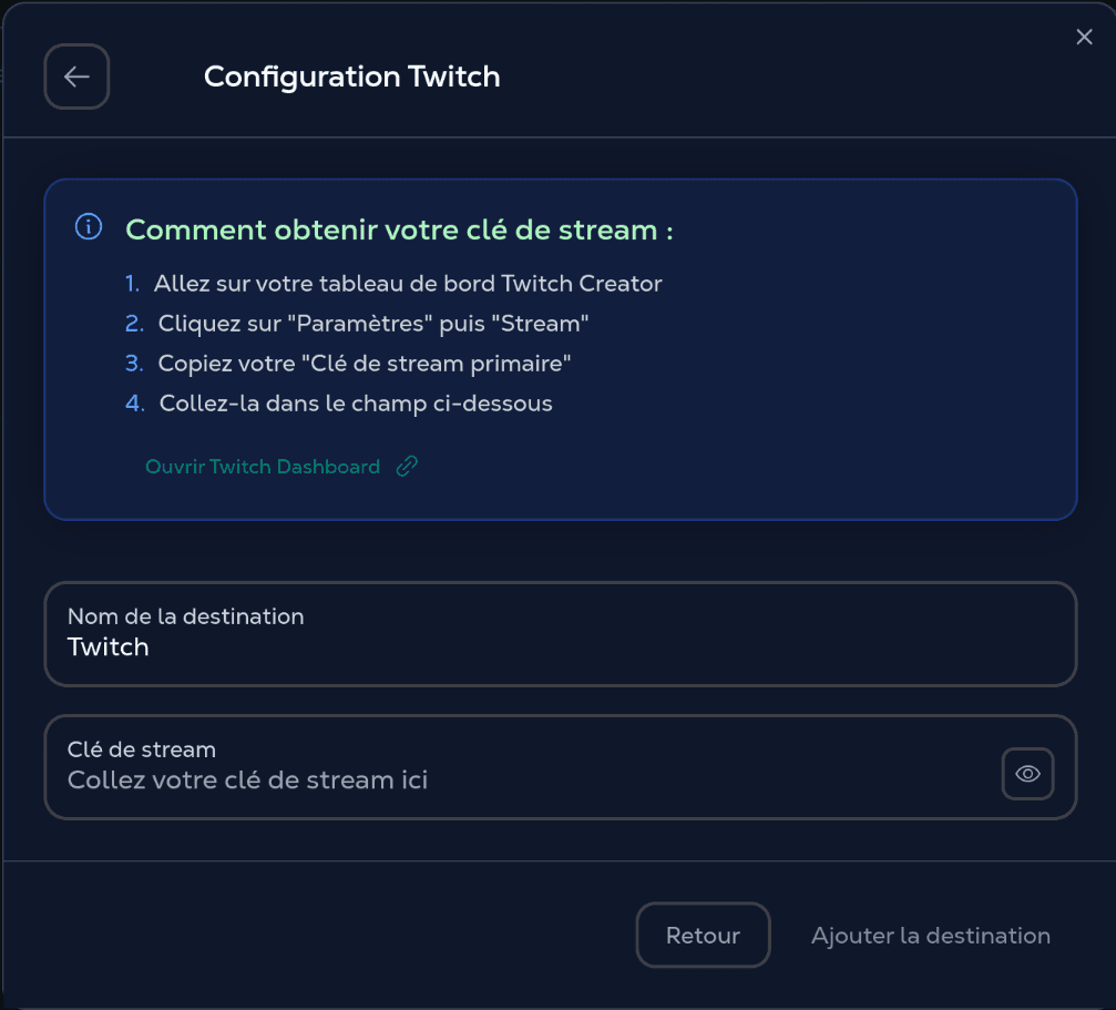 Ensuite, vous pourrez donner un nom à votre destination (ici "Twitch", que vous pouvez personnaliser), ainsi que le champ "Clé de stream" dans laquelle coller votre clé.