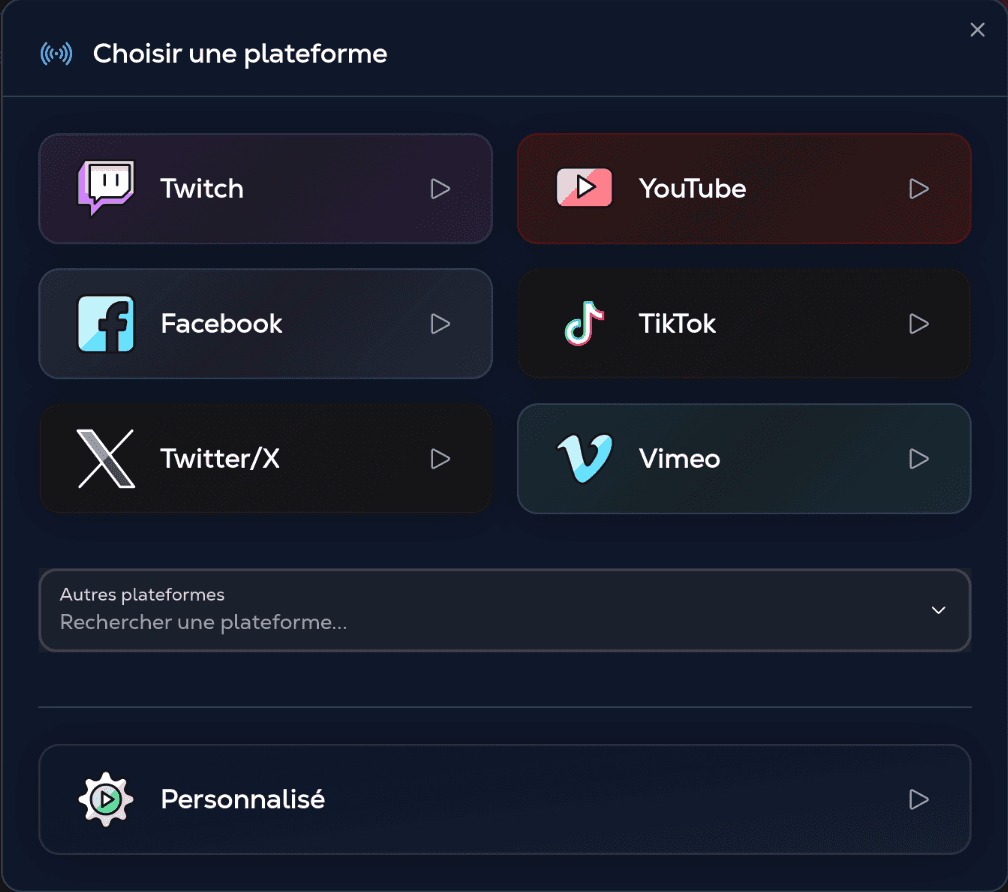 Dans le menu qui s'ouvre, vous pouvez choisir la plateforme vers laquelle vous souhaitez diffuser.