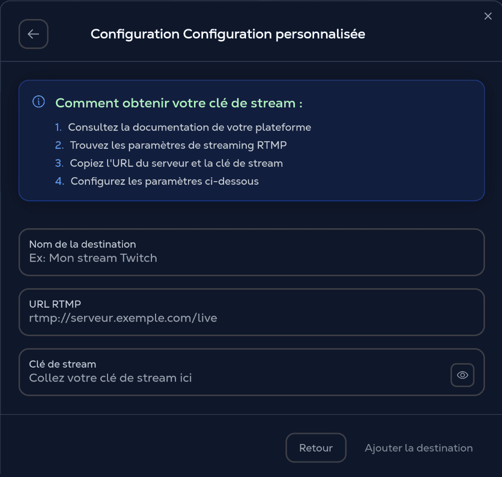 Si la plateforme sur laquelle vous souhaitez diffuser n'est pas dans la liste, ou vous souhaitez diffuser vers un serveur privé, aucun problème !