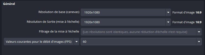 "Résolution de base (canevas)" correspond aux dimensions de votre espace de travail, celui dans lequel vous allez customiser vos Scènes (Intro, Live, Pause, Outro, etc) en y ajoutant vos Sources (Webcam, habillages graphiques, alertes, etc).